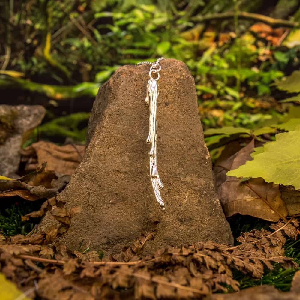 Handcrafted from recycled sterling silver and suspended on a 45 cm silver chain, this pendant keeps the same abstract, molten design that gives the larger version its distinct identity. It doesn’t aim to be figurative, but the lines suggest movement, flow, and a kind of quiet strength. The surface is polished just enough to catch the light, but it still holds on to a bit of casting texture that gives it character.
